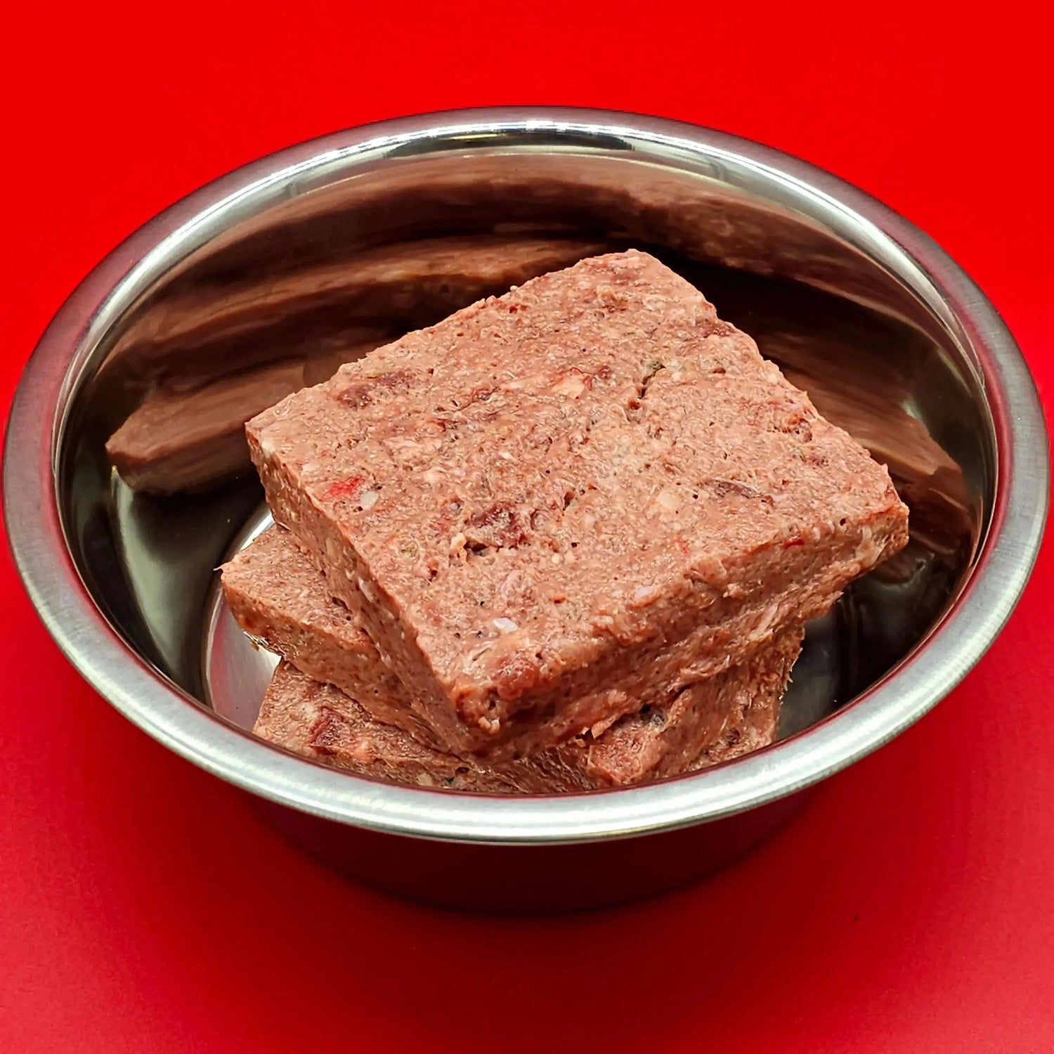- Ratio: 75% Meat / 10% Bones/ 10% Organs / 5% Fruits and Vegetables\